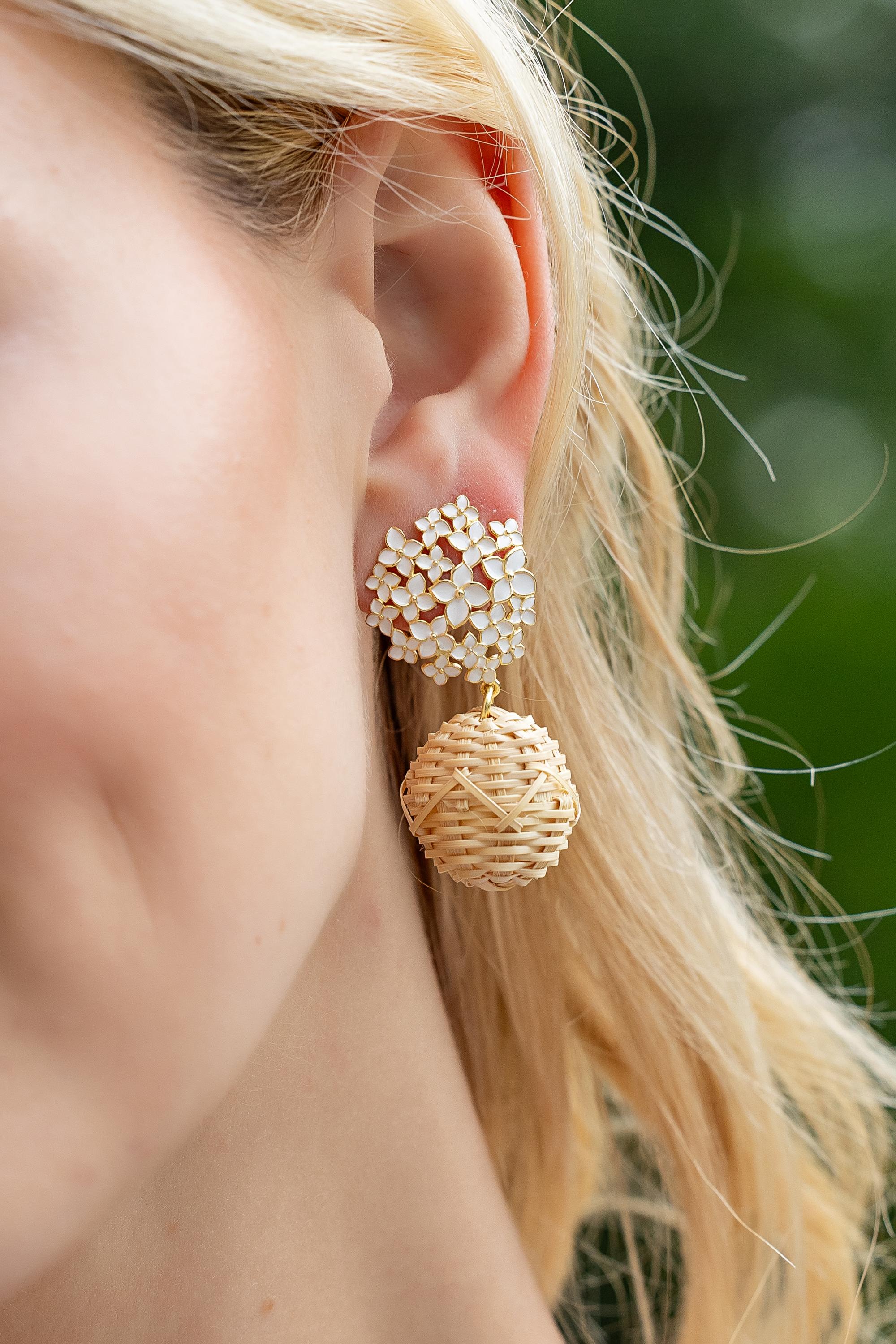 Delicate white enamel hydrangea flower cluster posts with woven rattan ball. Beautiful,  lightweight and easy to wear. Also available in Clip On version.