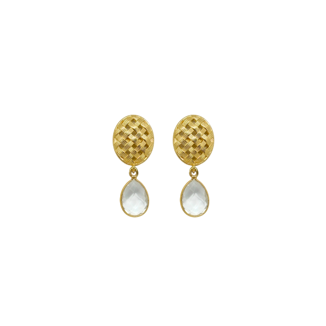 These elegant earrings feature a woven basketweave stud, paired with a single clear crystal quartz teardrop, set in a delicate gold frame. Wear them seamlessly from day to night.