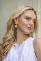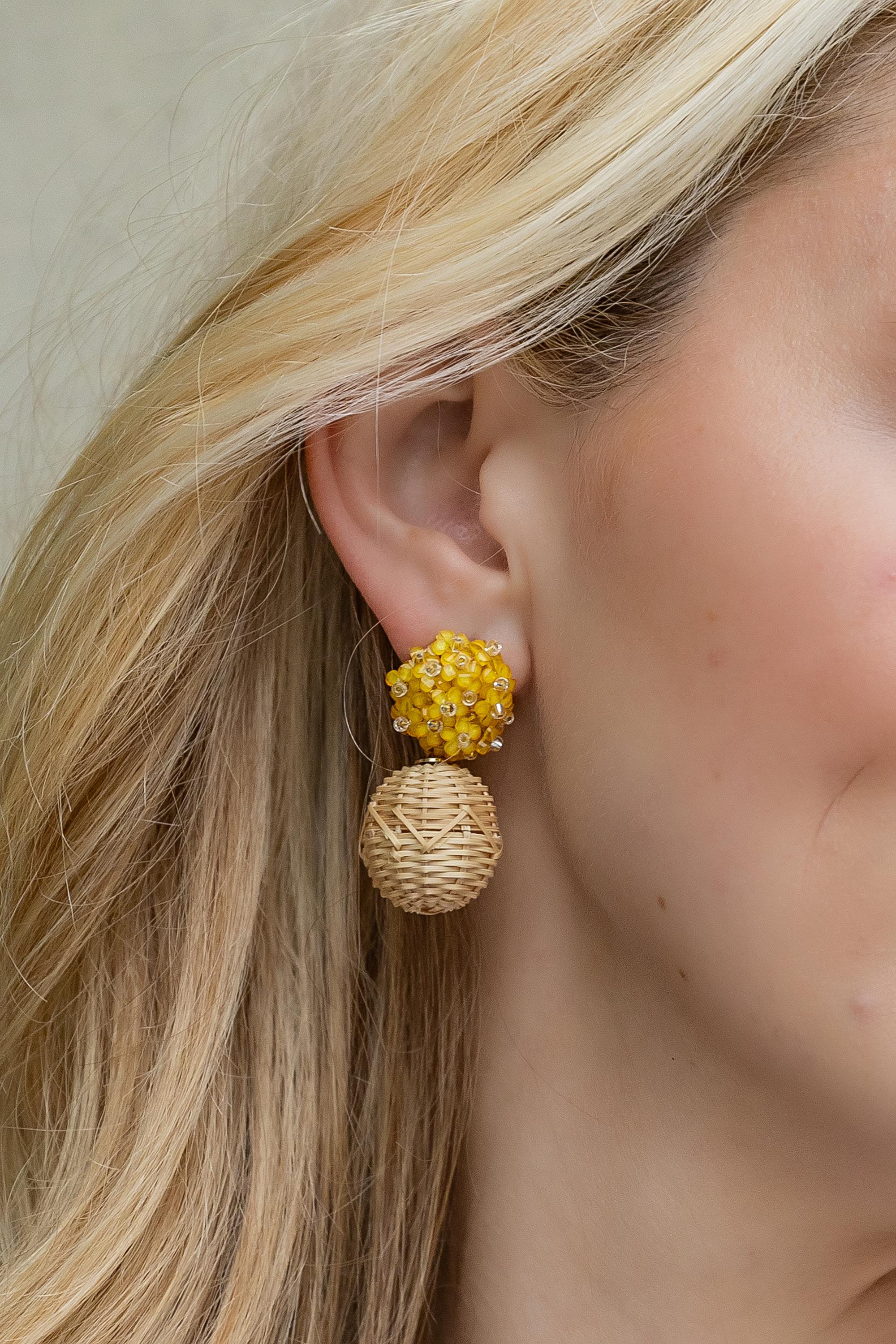 Delicate yellow flower cluster posts with woven rattan ball. These earrings are lightweight and easy to wear.