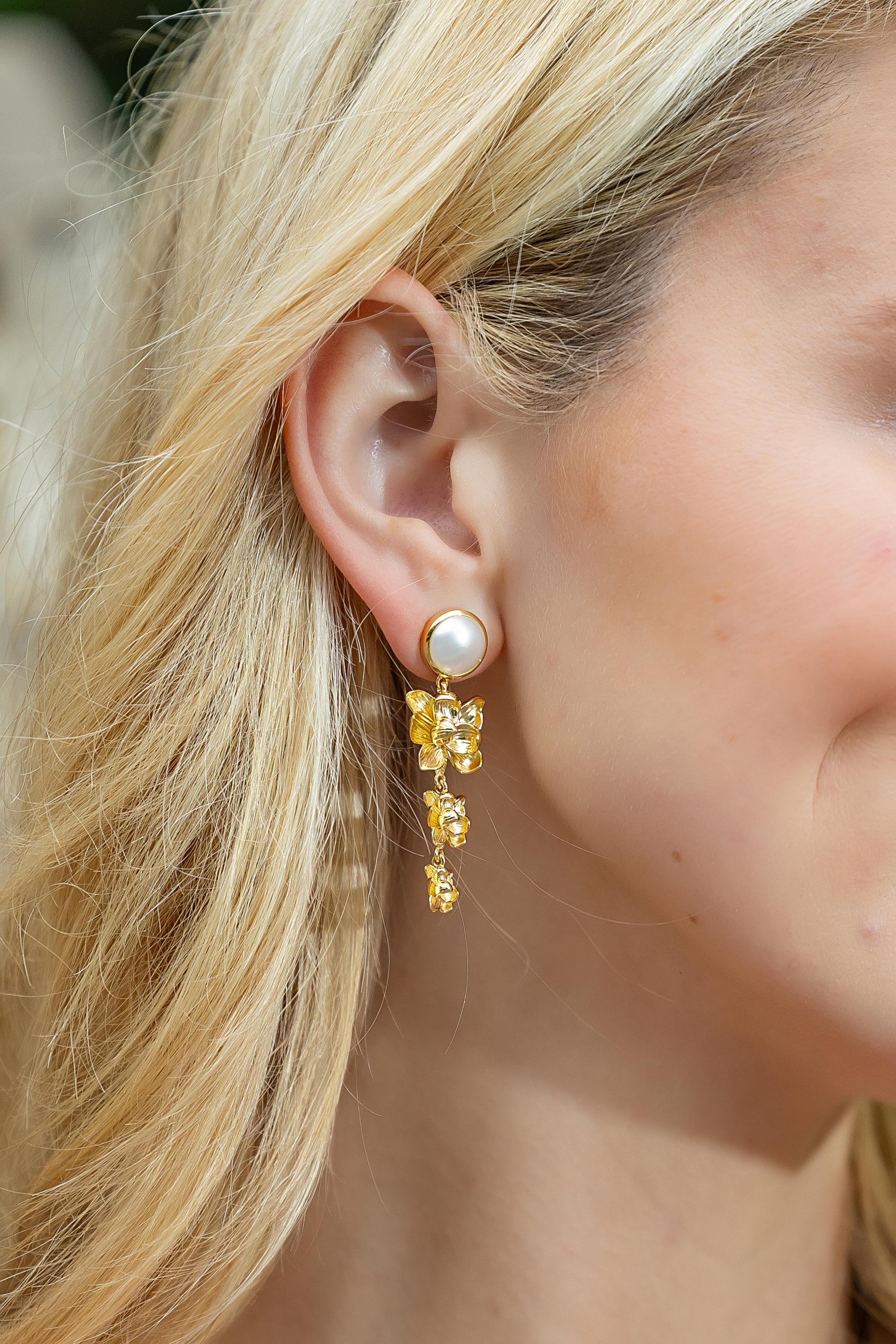 Embrace sophistication with our gold-plated magnolia vine earrings, designed to capture the graceful beauty of blooming magnolia flowers. Their intricate vine detailing and lustrous finish make them a timeless accessory that adds a touch of elegance to any outfit. Freshwater pearl posts.